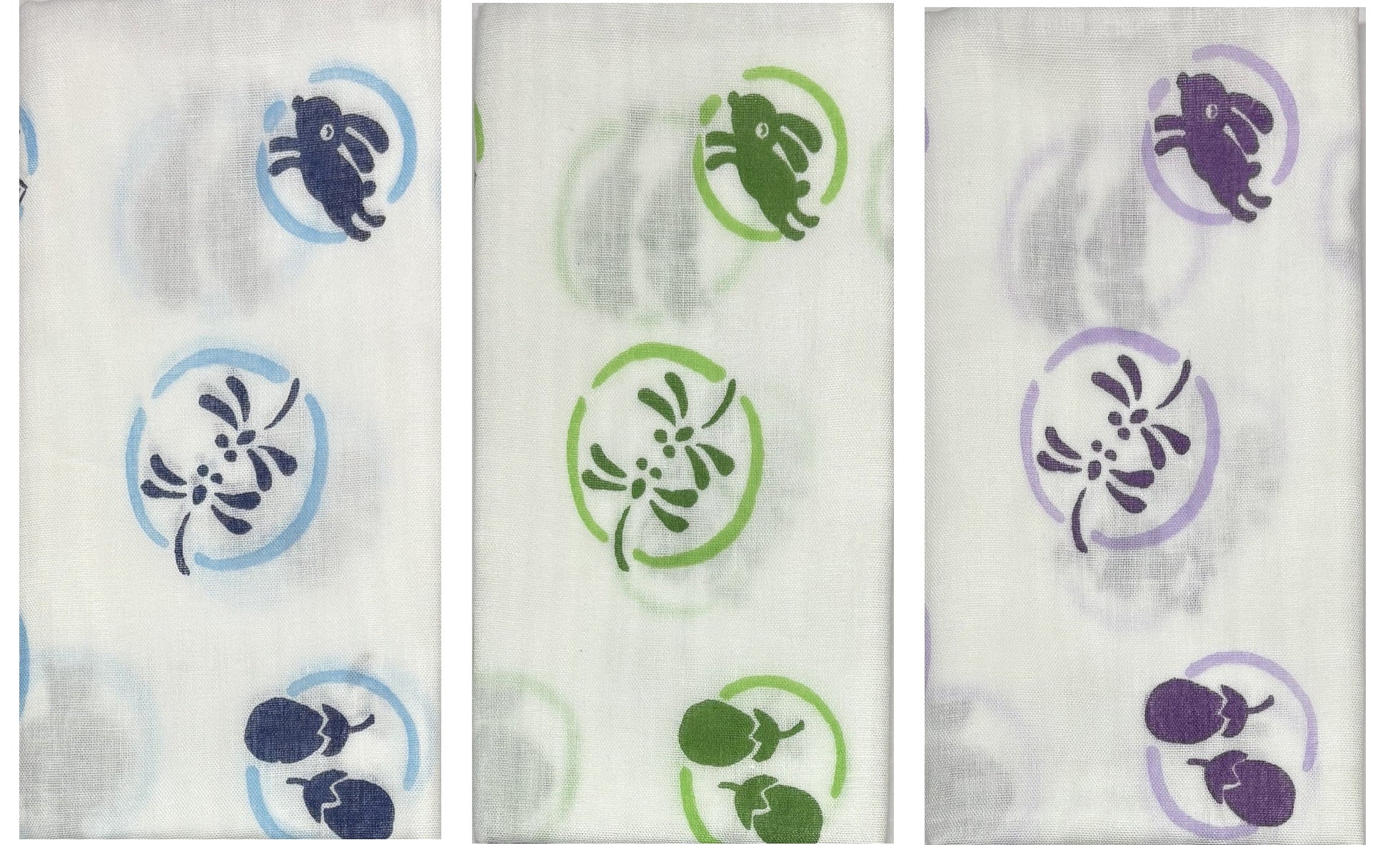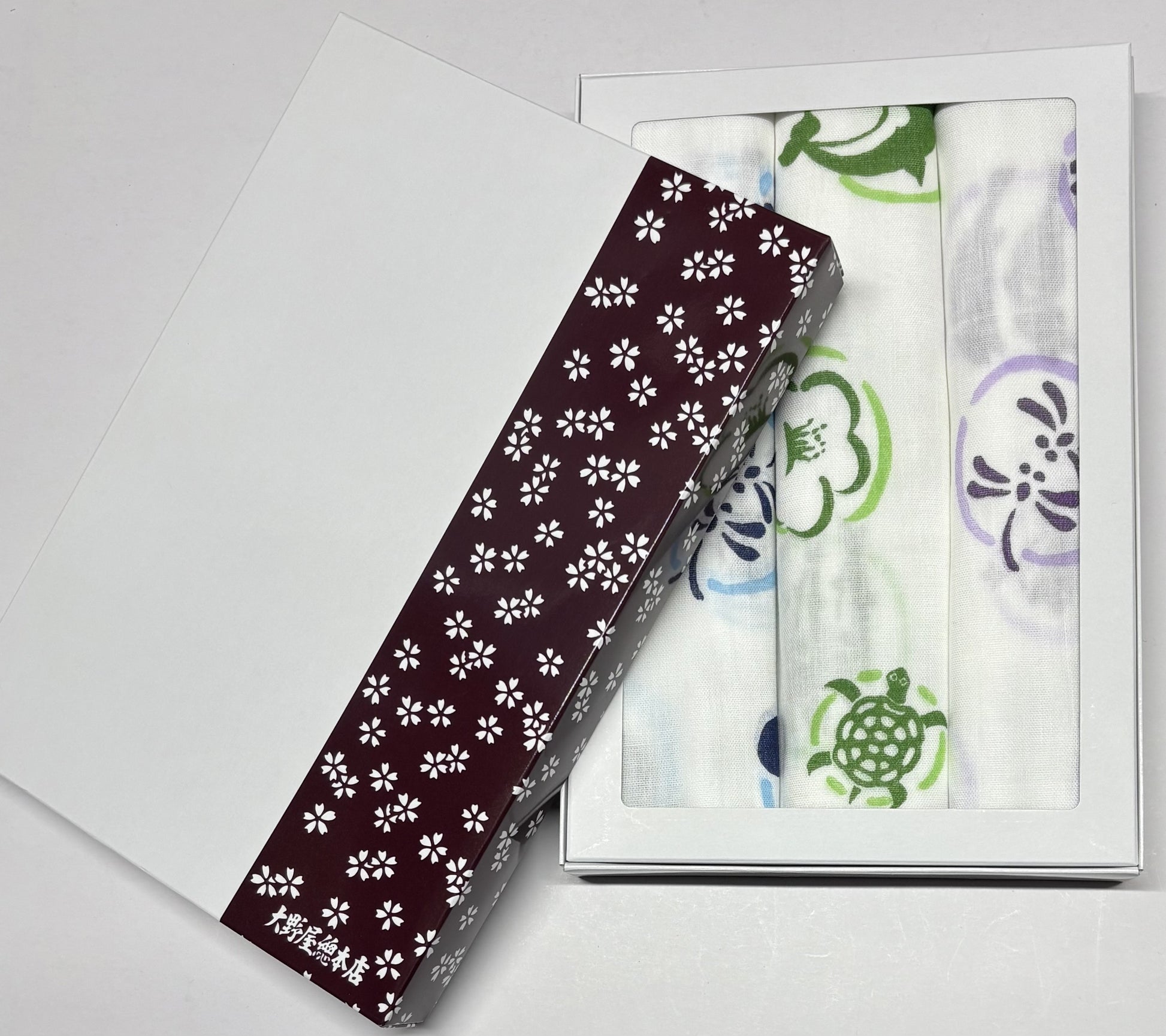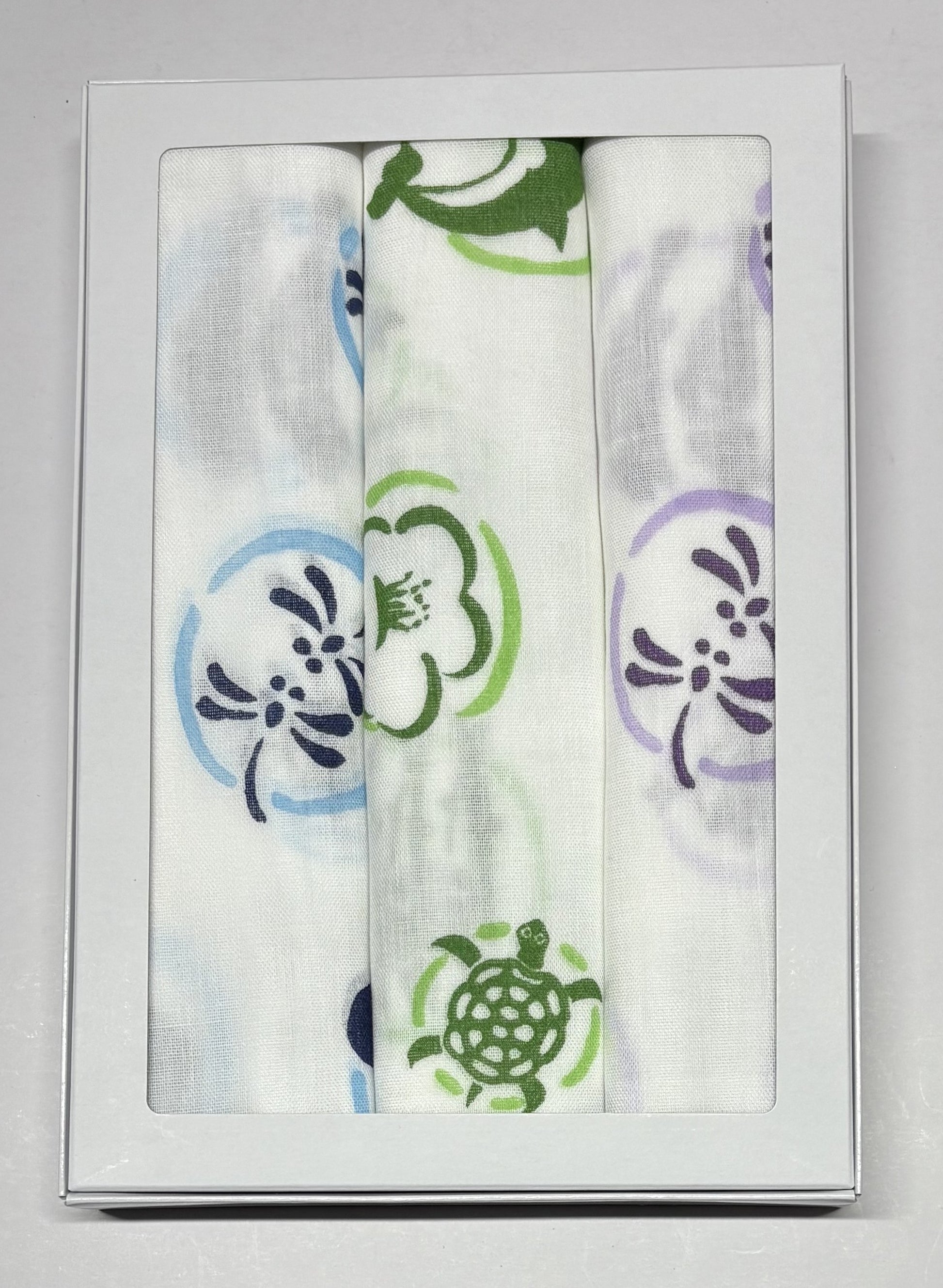 縁起の良い柄のガーゼ手拭3枚セット箱入りです。(青色、緑色、紫色)
