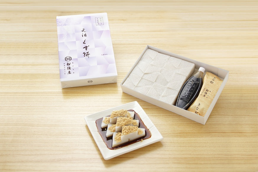 くず餅は上質の小麦澱粉を使用し、15ヶ月もの間、乳酸菌発酵精製したうえ、1つ1つ丁寧に蒸し上げたものです。