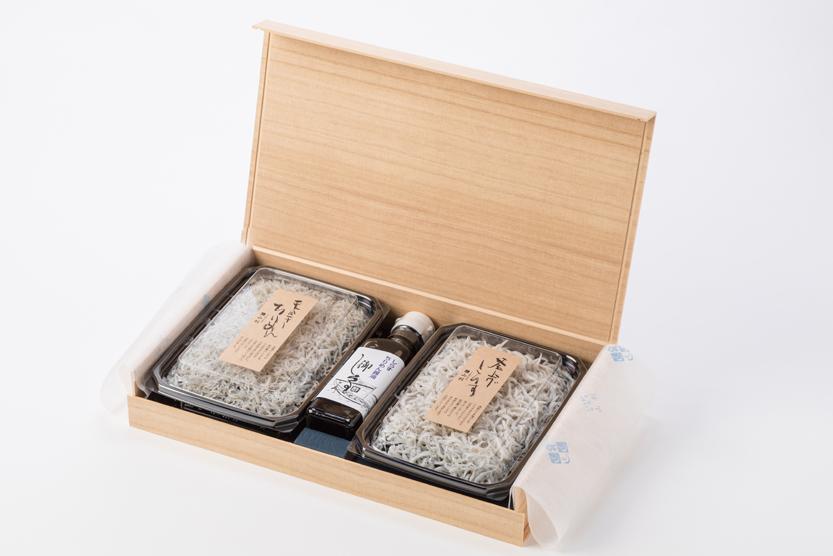 山利の定番商品を使い切りサイズの小パックに詰め、オリジナルしらす専用醤油:御しらすさんと共に自然な木箱の風合いのギフトボックスにお入れしました。