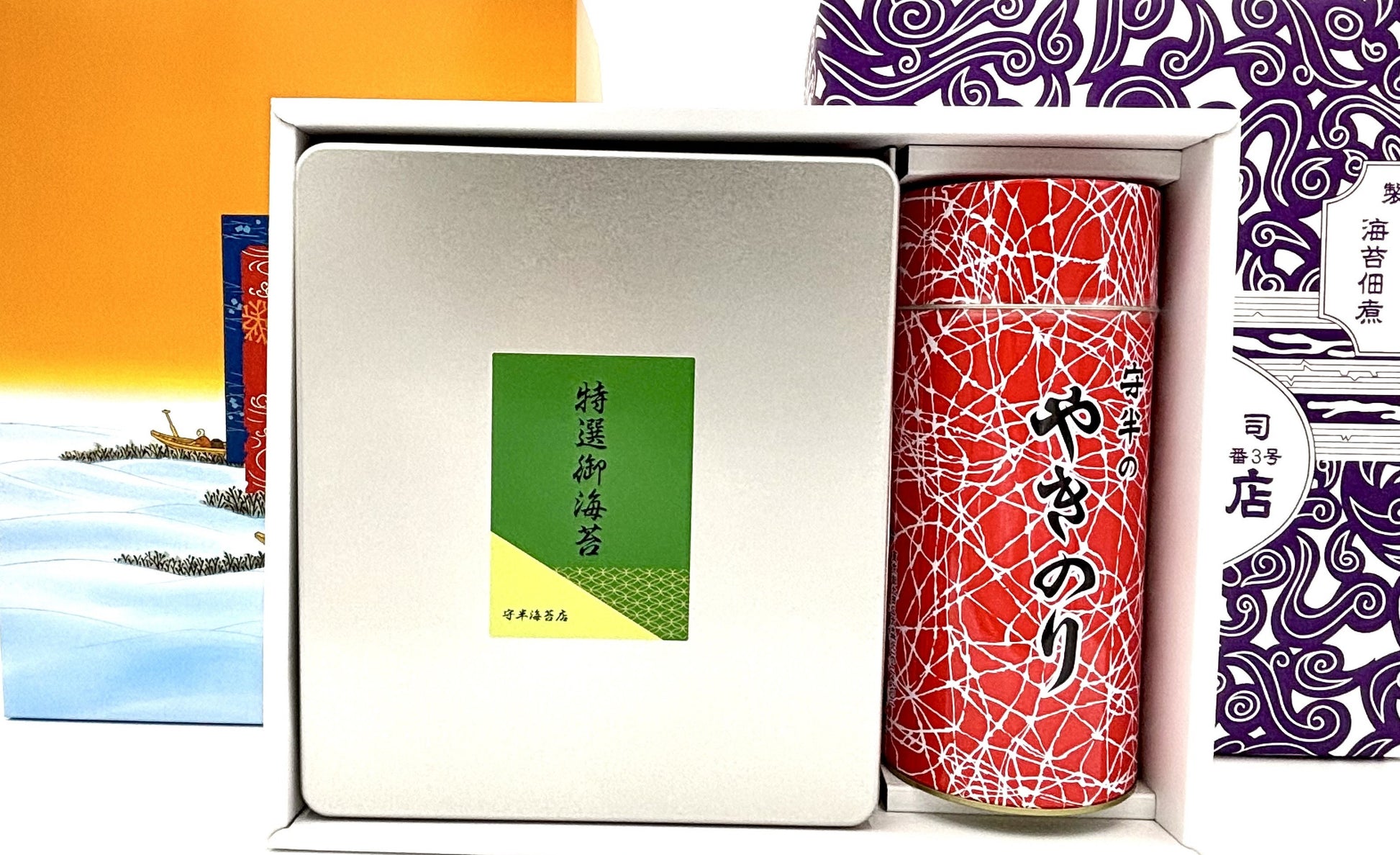 板のり9切180枚入りと板のり8枚入5袋のセット商品です。板のり9切180枚入りは当店の中でも一番の当たり浜の海苔を詰めており、板のり8枚入5袋は〇等級を使用しており、サクサクとしていて、歯切れのいい良質の全型を使用しております。